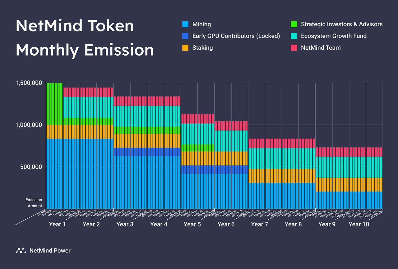 - Team Fund: 10 million NMT (6.78% of total supply) for the NetMind technical team, distributed over 10 years.