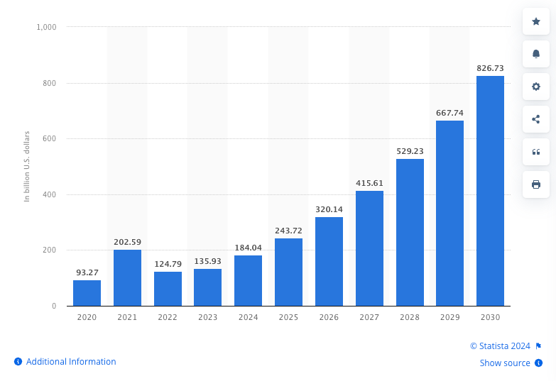 The AI market is experiencing explosive growth, according to the latest data insights from Statista, the AI market surpassed $184 billion in 2024, marking a remarkable increase from previous years. Projections indicate that this growth trajectory will continue, with the market expected to exceed $826 billion by 2030.