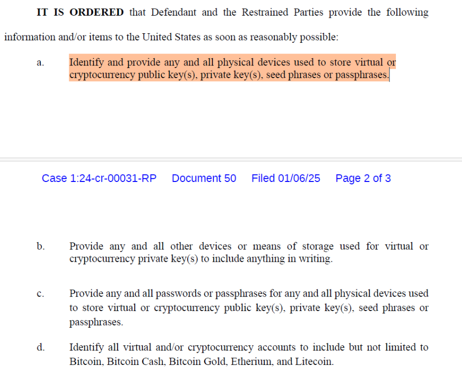 Vào ngày 6 tháng 1, Thẩm phán Tòa án Liên bang Austin, Robert Pitman, đã ra lệnh yêu cầu Ahlgren, cùng với gia đình, bạn bè hoặc đại diện của ông, phải xác định và cung cấp tất cả thiết bị được sử dụng để lưu trữ tiền điện tử, cùng với public keys, private keys, seed phrases (cụm từ hạt giống) và mật khẩu.