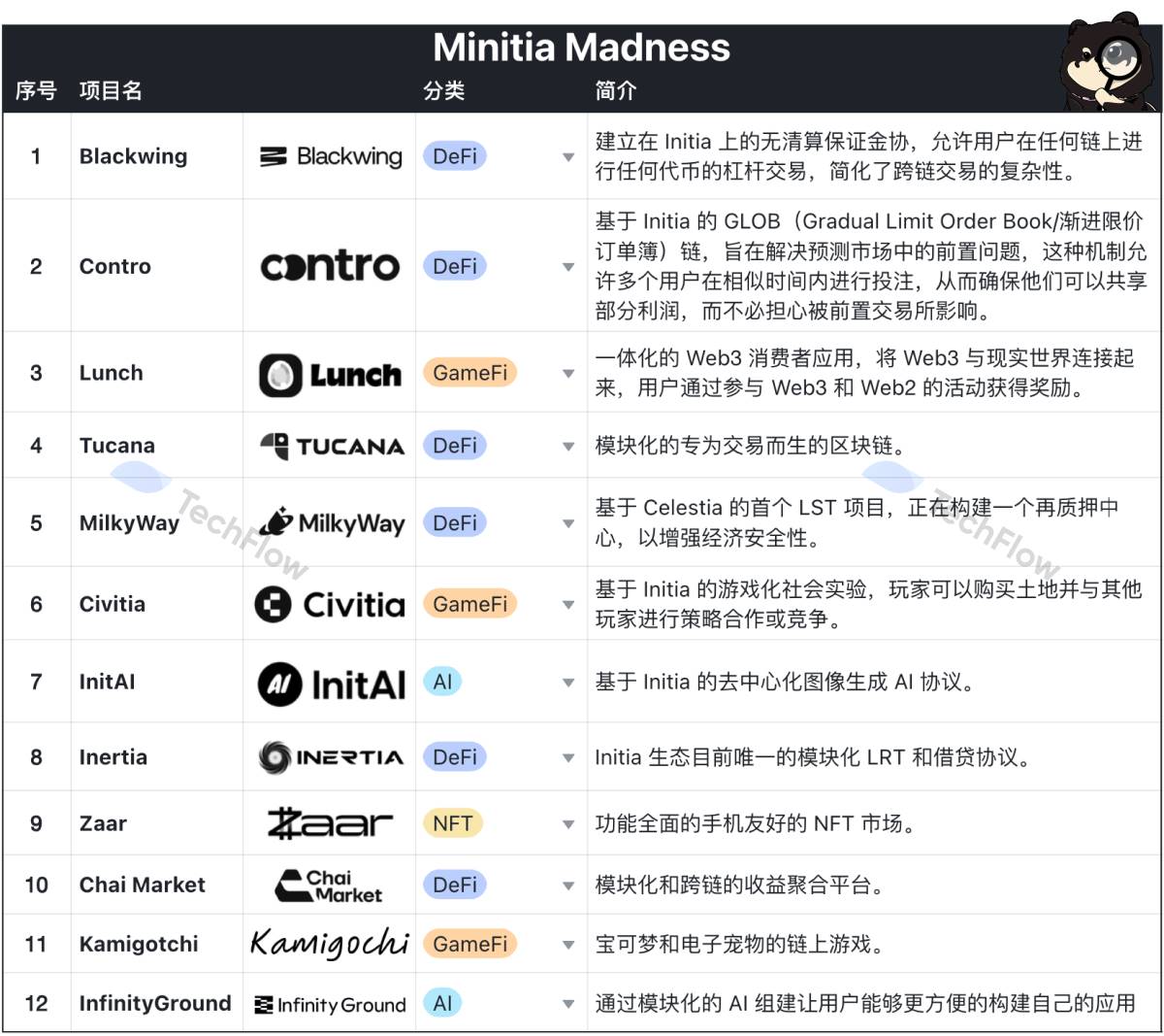 从官网来看,目前披露的生态项目 (Minitias) 共有12个,涵盖 AI,DeFi,GameFi,NFT,具体如下:
