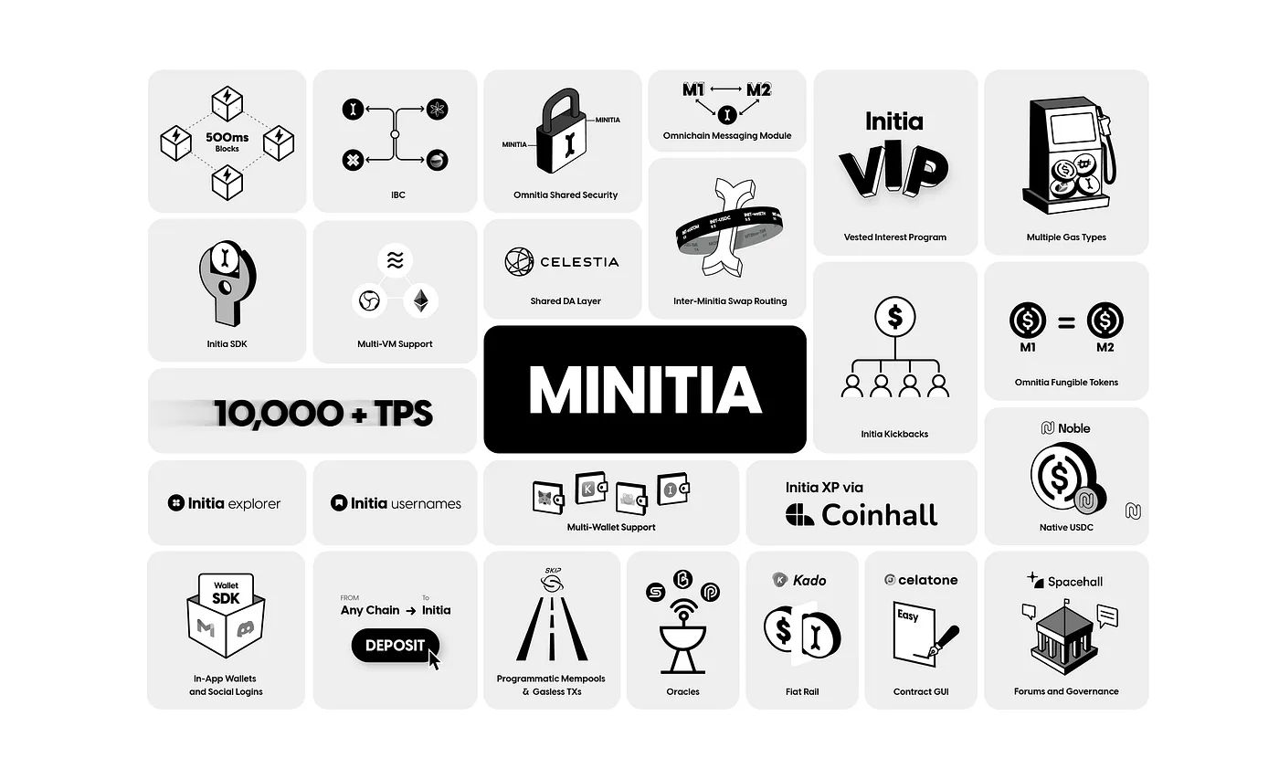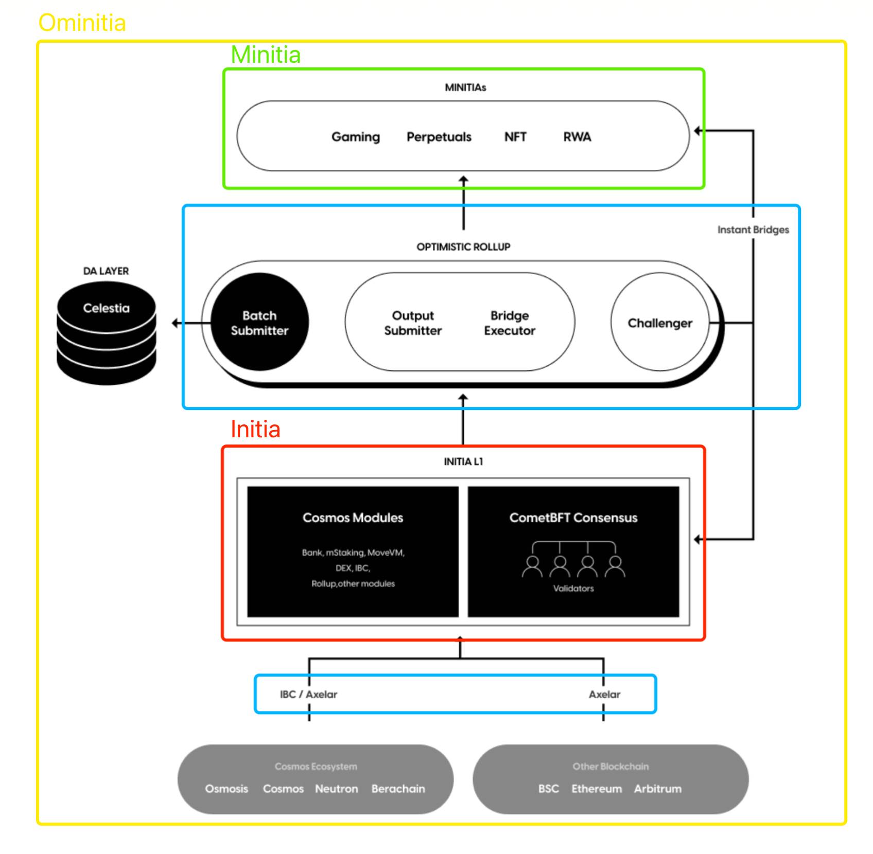 **Ominitia: **包含了 Initia (Layer1),Minitia(Layer2s),OPInit Stack,Bridging Middleware 等在内的所有核心组建的平台,称为 Ominitia.